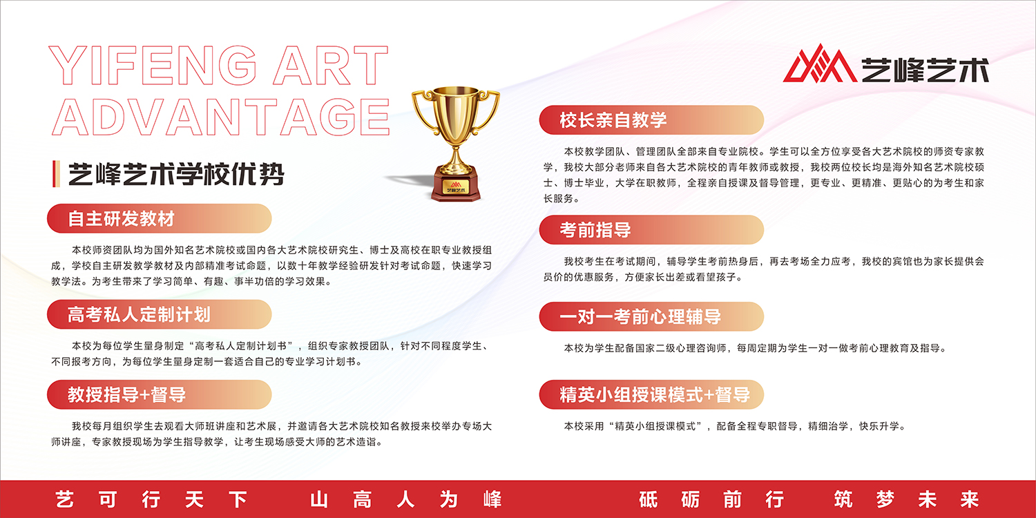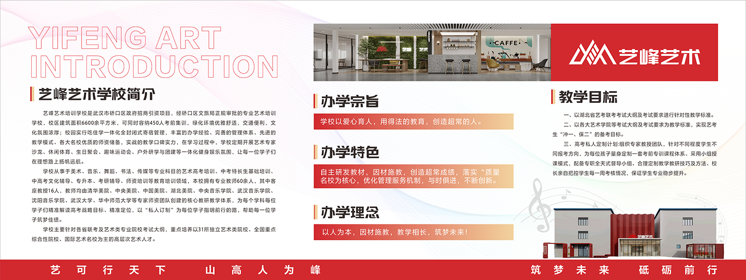 艺峰艺术学校是经武汉市硚口区文旅局批准的正规专业艺术民办学校,针对学生们的不同备考需求设置了艺术高考教育、中高考文化辅导、专升本、考研辅导、青少年艺术教育、师资培训等多样化的教学班型,招生类型囊括备考艺术生、高考复读生以及艺术类兴趣生三大类,为学生们的艺考道路增加更多优势与助力!